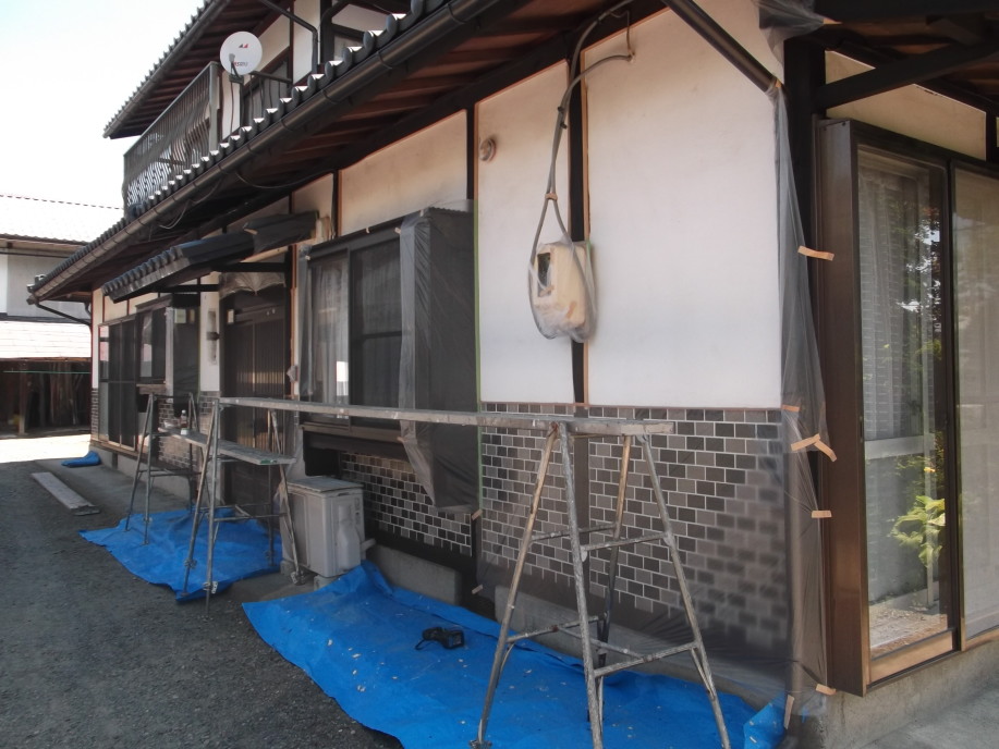 安曇野市の外壁塗装の紹介 工事内容/住宅/外壁(漆喰壁)塗装/木柱・軒天木部塗装です。外壁塗装は美観を保つだけではなく、建物を雨や風、カビなどから守るために必要不可欠な塗り替え工事です。