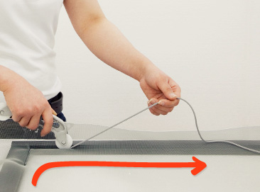 余分の網をカッターで切り落とします 押さえゴムのわきにカッターの刃を枠に向けて当て切っていきます