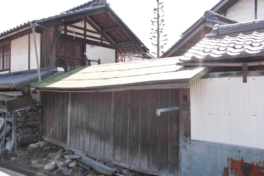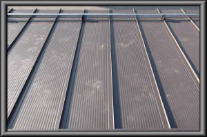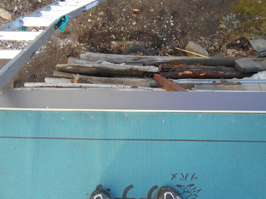 安曇野市の物置/トタン屋根葺き替え工事の紹介 工事内容/トタン屋根〜ガルバリウム鋼板立て平葺き(カバー工法)/雨樋交換/破風板取付工事です。
